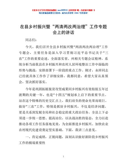 / 在县乡村振兴暨“两清两改两治理”工作专题会上的讲话