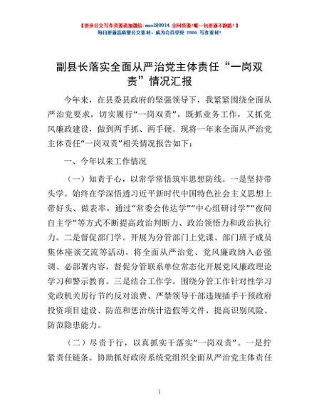 / 副县长落实全面从严治党主体责任“一岗双责”情况汇报