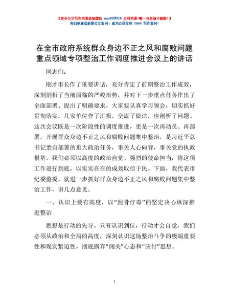 / 在全市政府系统群众身边不正之风和腐败问题重点领域专项整治工作调度推进会议上的讲话