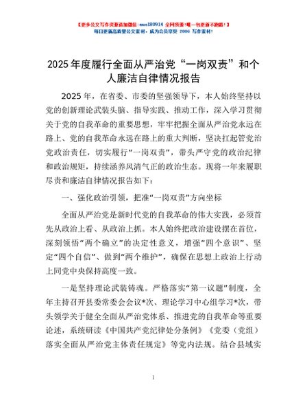 / 2025年度履行全面从严治党“一岗双责”和个人廉洁自律情况报告