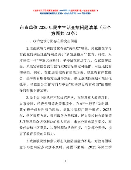 / 市直单位2025年民主生活查摆问题清单(四个方面共20条)