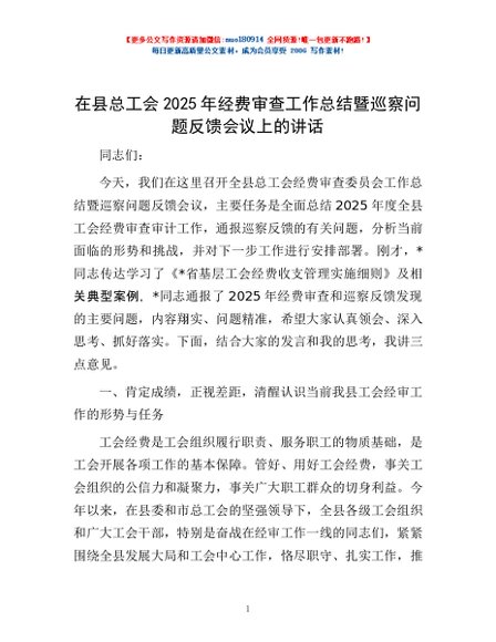 / 在县总工会2025年经费审查工作总结暨巡察问题反馈会议上的讲话