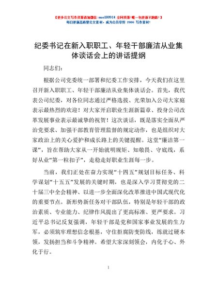 / 纪委书记在新入职职工、年轻干部廉洁从业集体谈话会上的讲话提纲