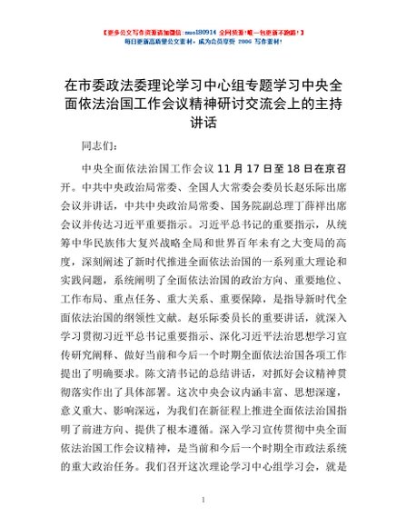 / 在市委政法委理论学习中心组专题学习中央全面依法治国工作会议精神研讨交流会上的主持讲话