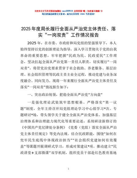 / 2025年度局长履行全面从严治党主体责任、落实“一岗双责”工作情况报告