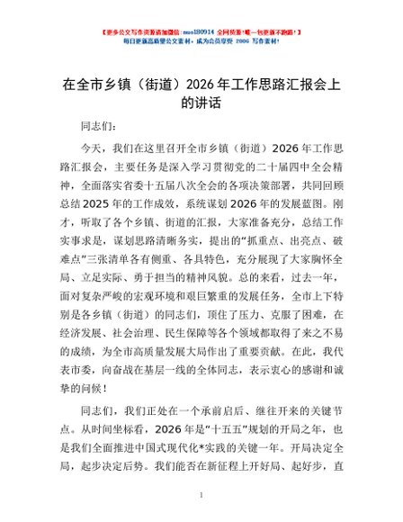 / 在全市乡镇(街道)2026年工作思路汇报会上的讲话