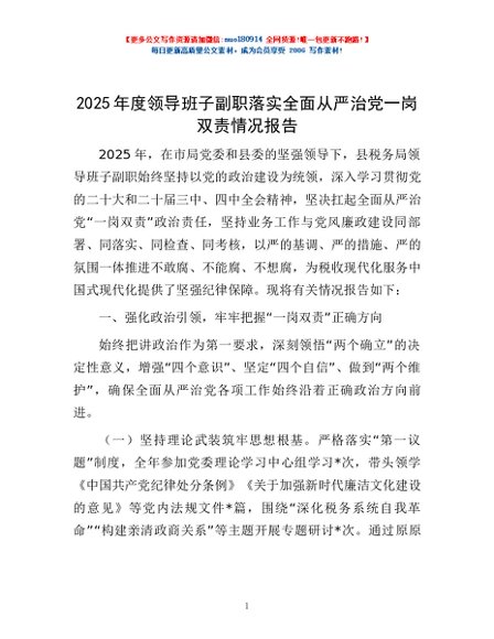 / 2025年度领导班子副职落实全面从严治党一岗双责情况报告