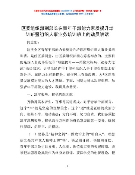 / 区委组织部副部长在青年干部能力素质提升培训班暨组织人事业务培训班上的动员讲话