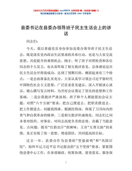 / 县委书记在县委办领导班子民主生活会上的讲话