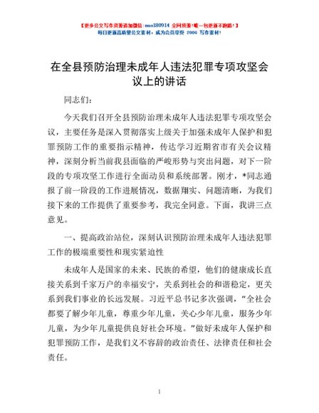 / 在全县预防治理未成年人违法犯罪专项攻坚会议上的讲话