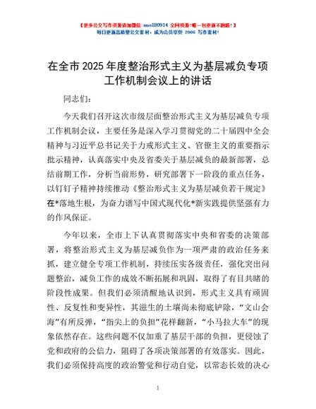 / 在全市2025年度整治形式主义为基层减负专项工作机制会议上的讲话