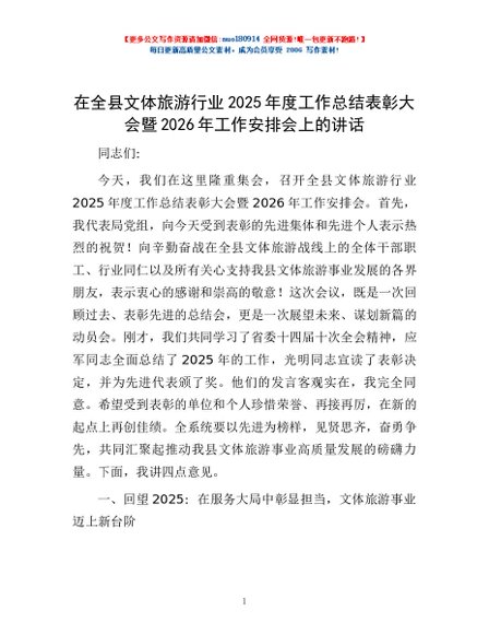 / 在全县文体旅游行业2025年度工作总结表彰大会暨2026年工作安排会上的讲话