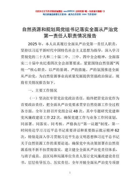 / 自然资源和规划局党组书记落实全面从严治党第一责任人职责情况报告