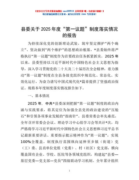 / 县委关于2025年度“第一议题”制度落实情况的报告