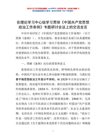 / 在理论学习中心组学习贯彻《中国共产党思想政治工作条例》专题研讨会议上的交流发言