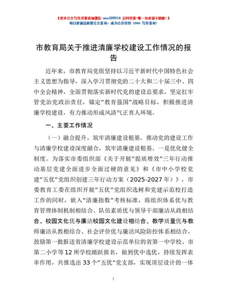 / 市教育局关于推进清廉学校建设工作情况的报告
