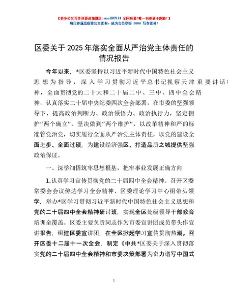 / 区委关于2025年落实全面从严治党主体责任的情况报告