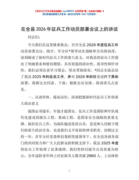 / 在全县2026年征兵工作动员部署会议上的讲话