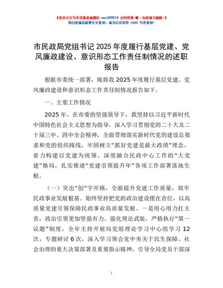 / 市民政局党组书记2025年度履行基层党建、党风廉政建设、意识形态工作责任制情况的述职报告