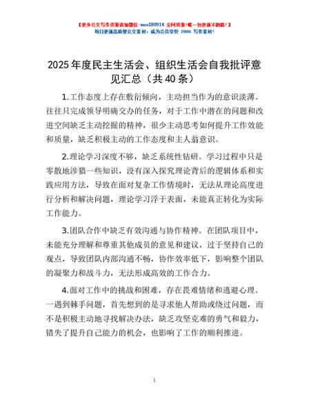/ 2025年度民主生活会、组织生活会自我批评意见汇总(共40条)