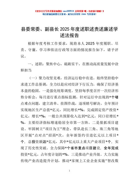 / 县委常委、副县长2025年度述职述责述廉述学述法报告