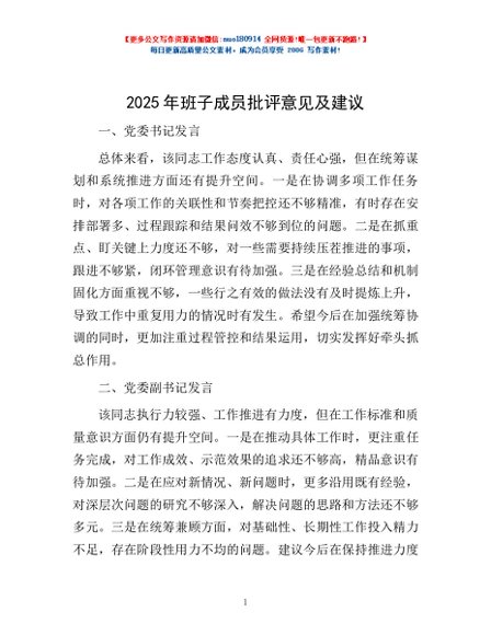 / 2025年班子成员批评意见及建议