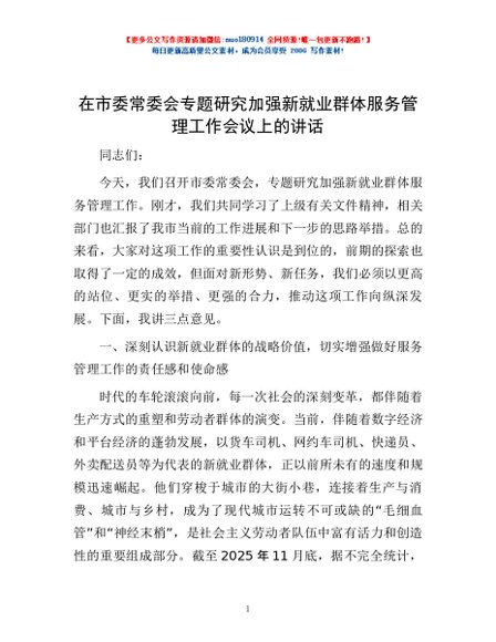 / 在市委常委会专题研究加强新就业群体服务管理工作会议上的讲话