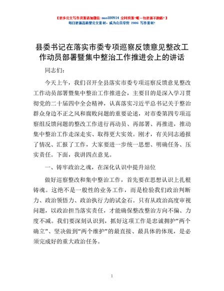 / 县委书记在落实市委专项巡察反馈意见整改工作动员部署暨集中整治工作推进会上的讲话