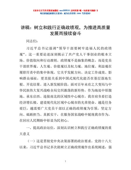 / 讲稿:树立和践行正确政绩观,为推进高质量发展而接续奋斗