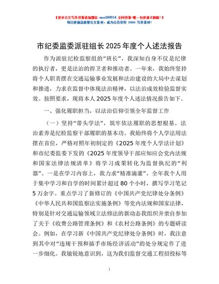 / 市纪委监委派驻组长2025年度个人述法报告