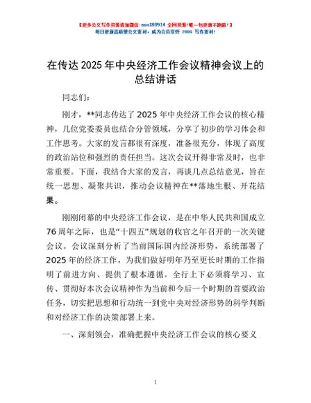 / 在传达2025年中央经济工作会议精神会议上的总结讲话