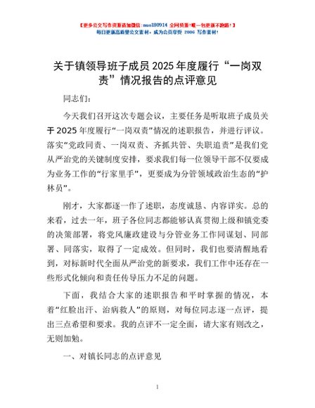 / 关于镇领导班子成员2025年度履行“一岗双责”情况报告的点评意见
