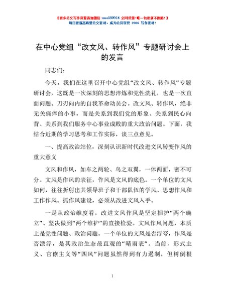 / 在中心党组“改文风、转作风”专题研讨会上的发言
