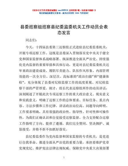 / 县委巡察组巡察县纪委监委机关工作动员会表态发言