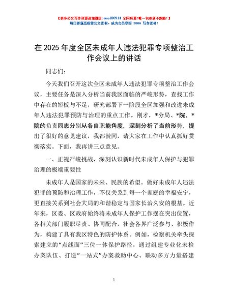 / 在2025年度全区未成年人违法犯罪专项整治工作会议上的讲话