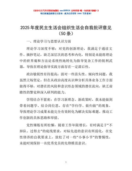 / 2025年度民主生活会组织生活会自我批评意见(50条)