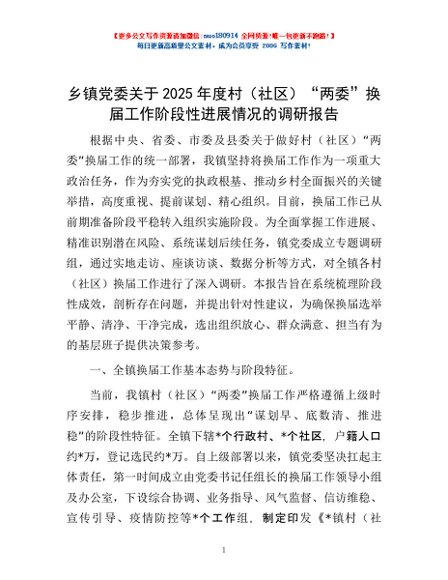 / 乡镇党委关于2025年度村(社区)“两委”换届工作阶段性进展情况的调研报告