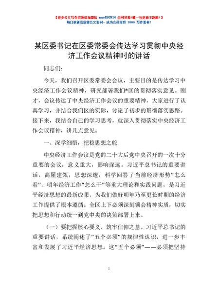 / 某区委书记在区委常委会传达学习贯彻中央经济工作会议精神时的讲话
