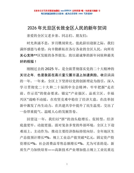 / 2026年元旦区长致全区人民的新年贺词