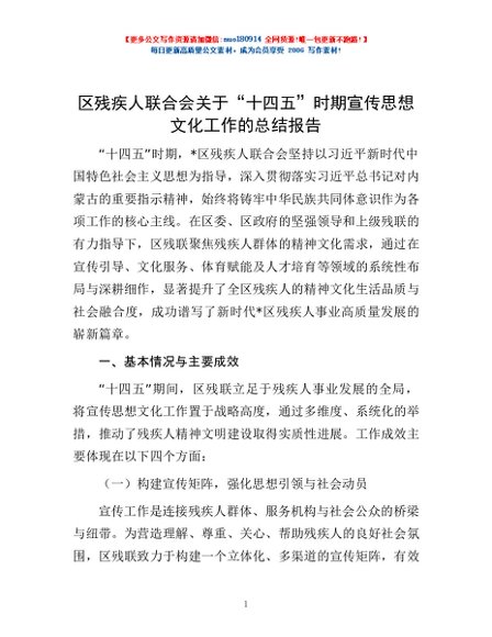 / 区残疾人联合会关于“十四五”时期宣传思想文化工作的总结报告