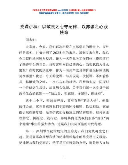/ 党课讲稿:以敬畏之心守纪律,以赤诚之心践使命