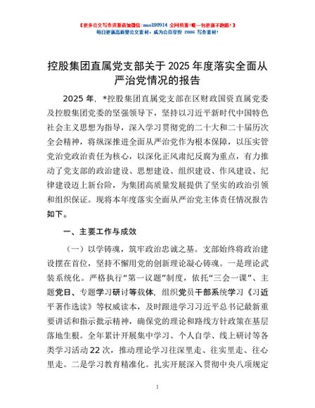 / 控股集团直属党支部关于2025年度落实全面从严治党情况的报告