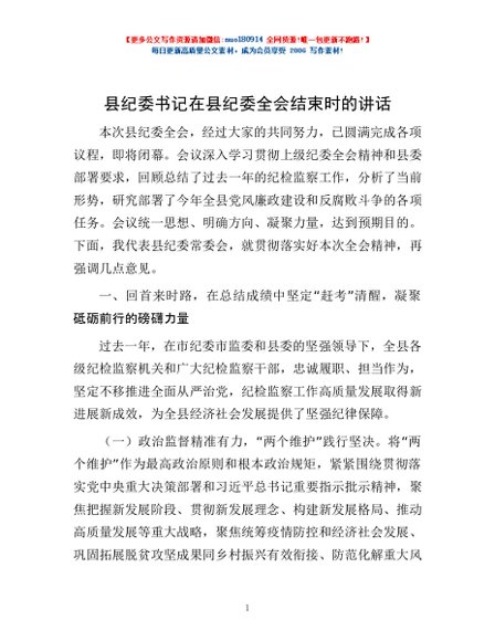 / 县纪委书记在县纪委全会结束时的讲话