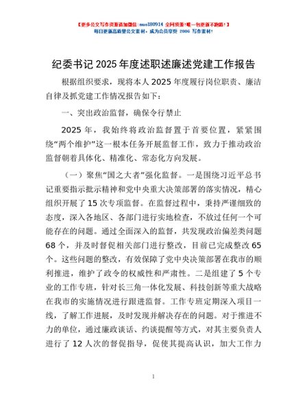 / 纪委书记2025年度述职述廉述党建工作报告