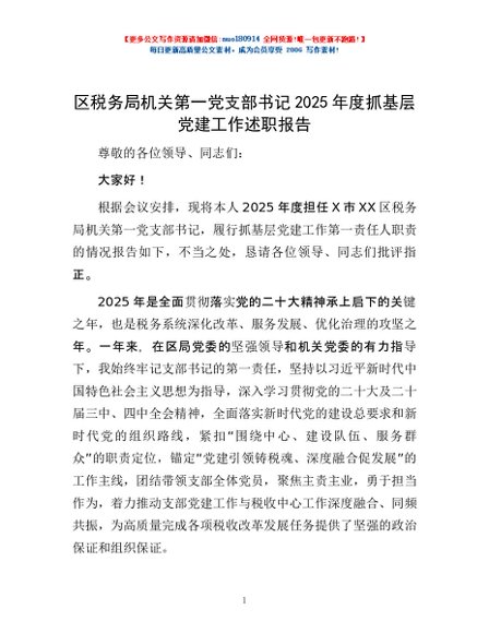 / 区税务局机关第一党支部书记2025年度抓基层党建工作述职报告