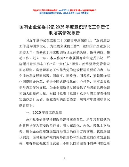 / 国有企业党委书记2025年度意识形态工作责任制落实情况报告