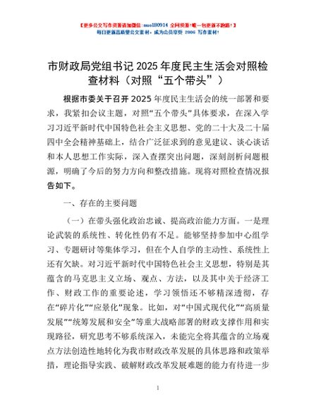 / 市财政局党组书记2025年度民主生活会对照检查材料(对照“五个带头”)