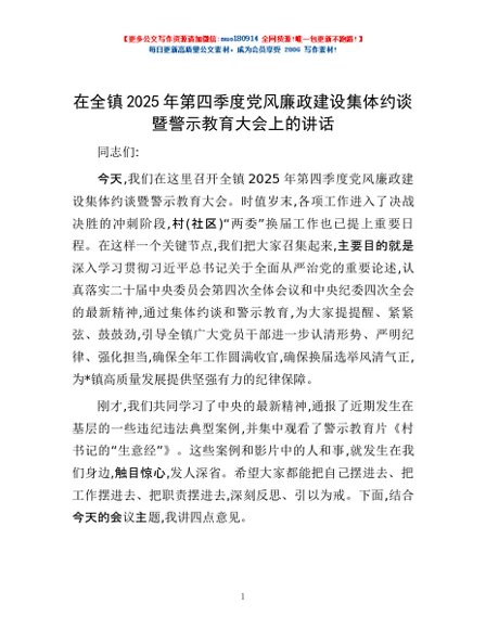 / 在全镇2025年第四季度党风廉政建设集体约谈暨警示教育大会上的讲话