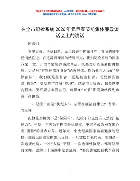 / 在全市纪检系统2026年元旦春节前集体廉政谈话会上的讲话