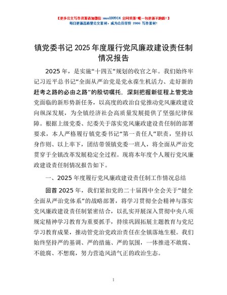 / 镇党委书记2025年度履行党风廉政建设责任制情况报告